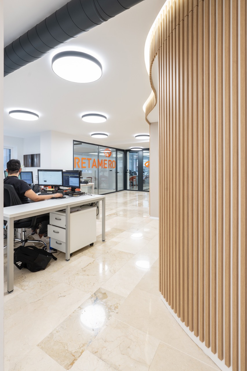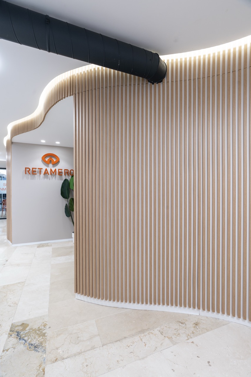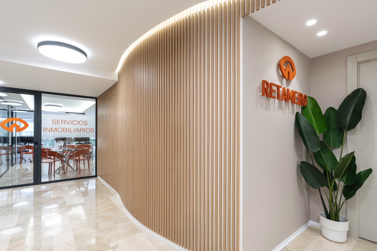 Identidad y coherencia visual: Uso de acabados y elementos que refuerzan la personalidad de Retamero, generando un ambiente corporativo armónico y reconocible.
